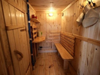 La variante la plus simple est le sauna à une pièce (photo 1, photo 2). Dans ce cas, le hammam, la salle de lavage et le vestiaire constituent une seule et même pièce. Il y a un four dans le coin et des étagères de 50 cm de large sur un mur (si la surface le permet, la largeur peut être augmentée). Sur l'autre mur (généralement près de la porte), il y a des crochets et des bancs pour les vêtements et les serviettes. C'est l'endroit le plus inconfortable pour mettre vos vêtements et vos serviettes. En hiver, après le sauna, il n'est pas très confortable de sortir avec des vêtements mouillés.