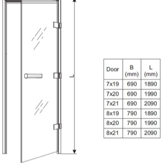 Вратите, изработени от закалено стъкло с минимална дебелина 8 мм, са подходящи за използване в сауни с високи температури и ниска влажност. Ниската влажност на въздуха означава, че вратата не се запотява, не се образува конденз, който капе на капки и образува локва на входа. Стъклото е идеално за този тип сауни.