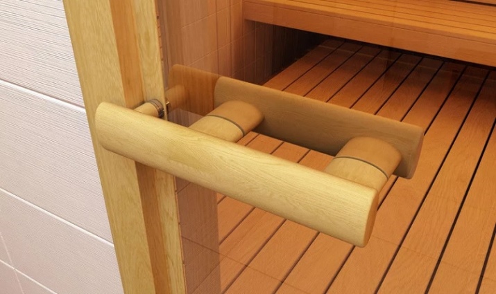 Високите температури в сауната не позволяват да се използва широката гама от дръжки за врати, предлагани от производителите. Много от тях прегряват, страдат от влажност или просто не са съвместими със стъкло. Най-добрият избор са дървените модели, изработени от масивна липа, ябълка, елша и други видове твърда дървесина, които не отделят смола при нагряване.