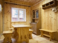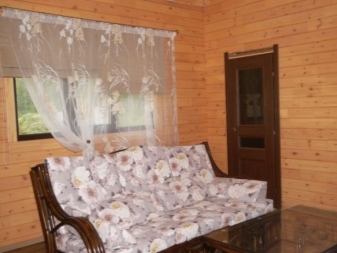 В стаята за релаксация в сауната често се поставя диван или няколко фотьойла. Желателно е да изберете такива завеси на прозорците, които да повтарят тапицерията или покритието на мебелната конструкция. Тогава обзавеждането ще бъде много хармонично и добре обмислено.