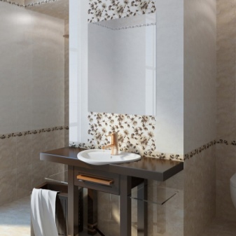 Бежовите и кафявите нюанси изглеждат чудесно на фона на декорацията, която играе ключова роля в цялостната картина, тъй като нейният елемент - трогателно цвете сакура с пет венчелистчета - елегантно демонстрира японския мотив. В бордюрите също има елементи на природата под формата на бели цветни листенца. Елегантният кафяв цвят на фаянса допълва картината.