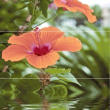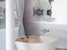Панелът с цветя допълва ярките цветове с реалистични изображения на разцъфнали рози и падащи венчелистчета. Подовите плочки допълват картината, продължавайки темата за романтиката.