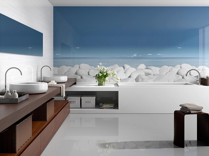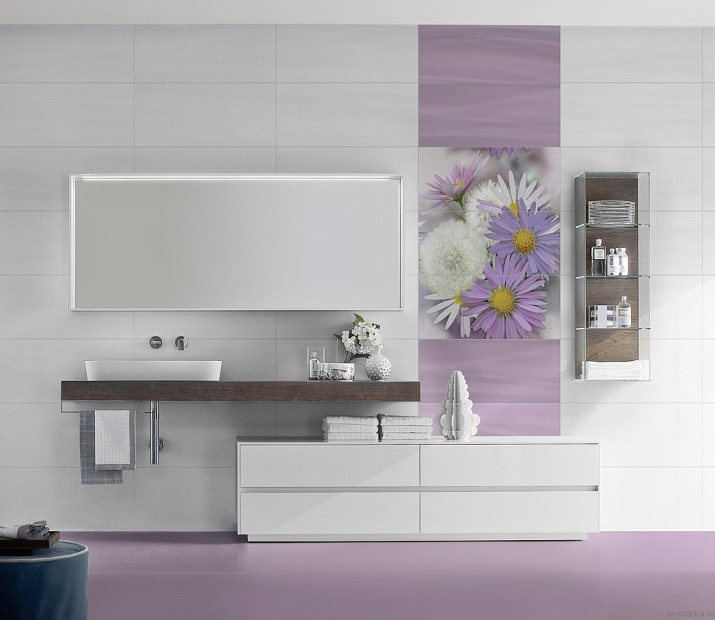 Такива плочки могат да бъдат идеална декорация не само за банята, но и за кухнята. Техните спокойни и успокояващи тонове осигуряват релаксираща атмосфера след дълъг ден, а имитацията на мрамор ще добави нотка аристократизъм към цялостната картина.