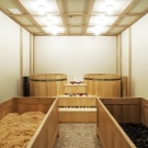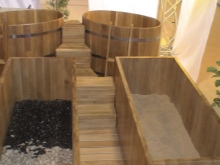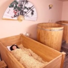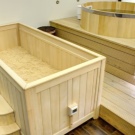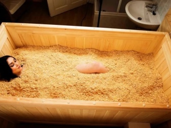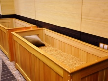 - Nyní je čas na suchou koupel Ofuro. Je třeba se ponořit na 10 minut do vany naplněné pilinami. Nejde jen o piliny, ale o na 45 stupňů zahřáté drcené dřevěné částice smíchané s léčivými bylinami a éterickými oleji. Tělo se na tuto hojivou hmotu postupně adaptuje. Během této doby se člověk aktivně potí, ale je to bezpečné - srdce, hlava a oblast krku nejsou zasaženy. Piliny masírují periferní cévy a klouby, čímž zahřívají tělo a uvolňují ho. Poté byste se měli osprchovat, abyste smyli zbytky pilin.