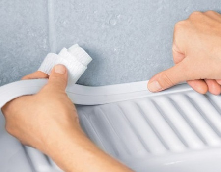 - Poté utěsněte místa, kde se vana a stěna vzájemně dotýkají, tmelem. I když je vana těsně u stěny, zůstávají v ní mezery. Vlhkost se může dostat dovnitř a způsobit plísně a hnilobu. Po utěsnění spáry se roh ošetří lepicím roztokem (tekutými hřebíky) a přiloží se k povrchu vany. Současně musí být lamela pevně přitlačena po celé ploše.