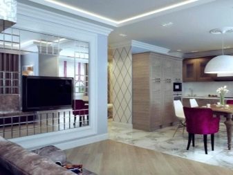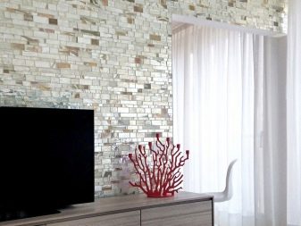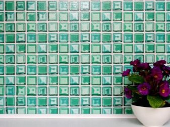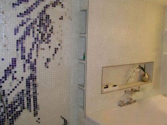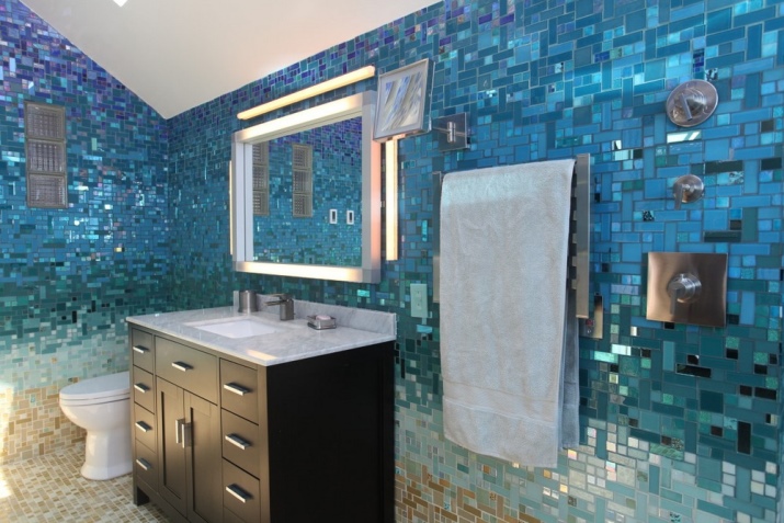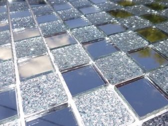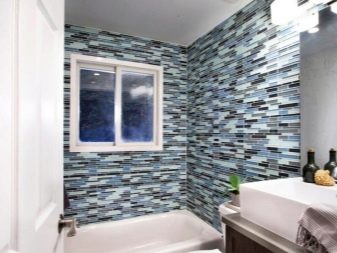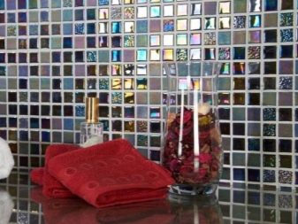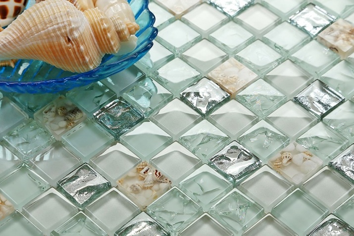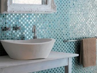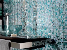 En anden interessant mulighed er brugen af glasmosaikker. De små, funklende fliser passer perfekt ind i indretninger i hvidt, sort, beige, blåt, rødt, blåt og alle andre farver. Med en mosaik kan du smukt fremhæve nogle af interiøret, såsom møbelskabe, spejle, lamper. Flerfarvede mosaikker kan også bruges til temadekorationer, f.eks.