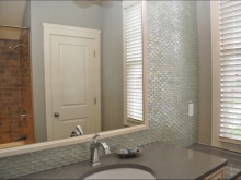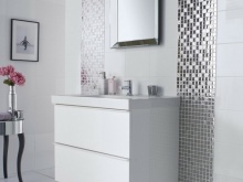 2. Badeværelse. Glasfliser kan være et værdifuldt alternativ til almindelige keramiske fliser. Glasdekor kan smukt supplere et keramisk panel som fodpanel. En glasmosaik kan også bruges til at indramme et spejl. Glas er ikke bange for vand, så sådanne fliser bruges oftest i badeværelser eller toiletter.
