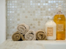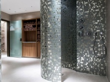 Badeværelset i lyse farver og dekoreret med spejlglasfliser er den perfekte løsning til selv de mindste rum. På trods af rummets beskedne størrelse føles det ikke trangt overhovedet. De omhyggeligt placerede belysningsarmaturer får rummet til at virke endnu mere rummeligt og lyst.