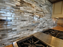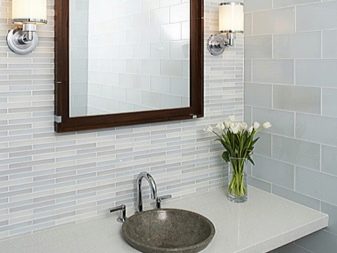 Glasfliser kan have forskellige former og størrelser. Glasstrimler med en bredde på 1-5 cm og en længde på 40-60 cm kan f.eks. bruges til at dekorere ethvert rum på en interessant måde. Sådanne strimler kan kombineres med klassiske matte eller blanke keramiske fliser.