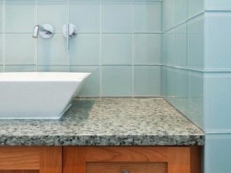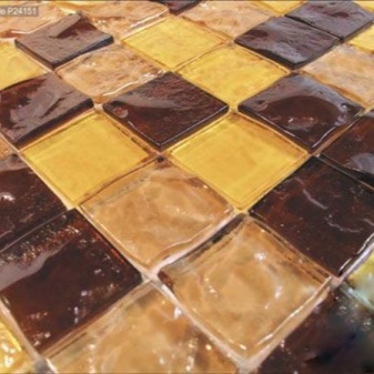 - "Marblet. Ud over farvet glas er flisen baseret på specielle lyddæmpende stoffer. Størrelsen af sådanne paneler er 100*100 mm og derover. Dette materiale anvendes hovedsagelig til dekoration af bordplader og vindueskarme.