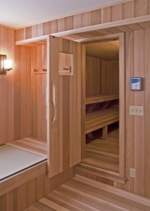 - Schiebe- und Drehtürblätter sind heutzutage sehr beliebt. Sie können mit einem speziellen Rollensystem ausgestattet werden, das ein ungehindertes Öffnen und Schließen der Strukturen ermöglicht. Eine Fachtür befindet sich normalerweise im Inneren der Sauna und dient nicht als Eingang.