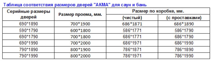 Die Standardhöhe für Türen, die in die Saunakabine führen, beträgt 1,6 m. Eine Schwellenleiste mit einer Höhe von 18 bis 20 cm ist obligatorisch. Übliche Breiten für Dampfbadtüren sind 700x1900, 800x1900 mm. Waschraumtüren können die üblichen Standardmaße haben, sind aber oft etwas breiter, um die Ausbreitung von Feuchtigkeit zu verhindern. Die empfohlene Breite der Türen, die in das Waschbecken führen, beträgt 0,60 cm.