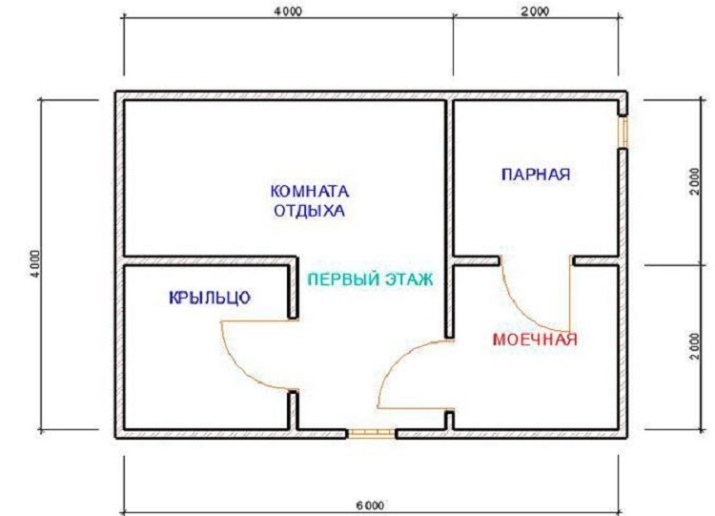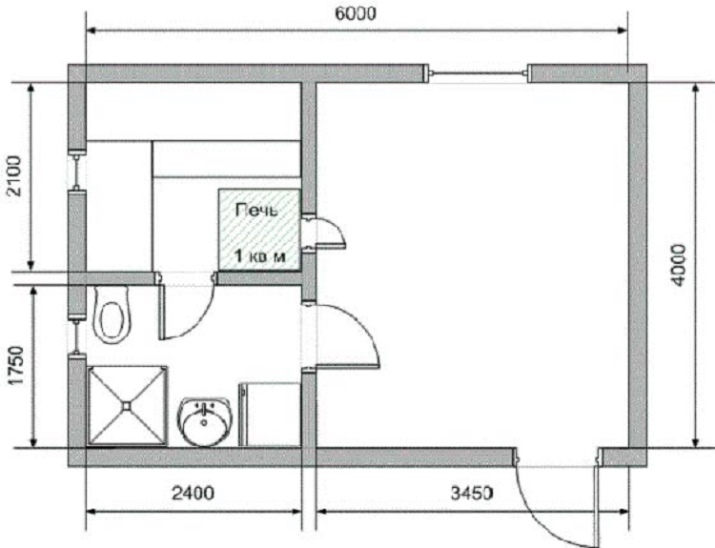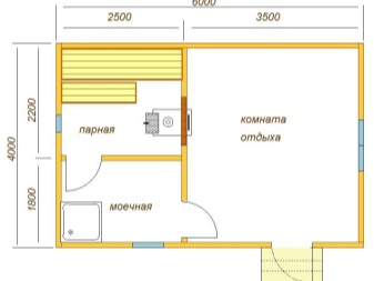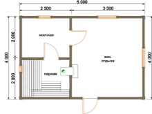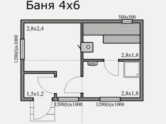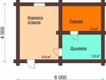 Für die Planung eines 6x4-Blockbades muss man mehr als eine Stunde einplanen. Es ist nicht nachhaltig, sich auf beengte und unscheinbare Gebäude zu beschränken, wie sie aus dem vorletzten Jahrhundert stammen. Das Foto zeigt eine Variante des Grundrisses, einschließlich: