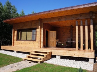 Eine offene Terrasse mit einer Fläche von 6 bis 8 m2 ist die häufigste. Der Boden besteht aus antiseptisch imprägnierten Platten. Spezielle Sägemehlplatten für Terrassen sind jetzt erhältlich. Sie sind preiswerter als herkömmliches Holz und in der Praxis genauso gut wie dieses. Tipp: Wenn der Platz nicht ausreicht, können Sie das Vorbad mit dem Ruheraum kombinieren.