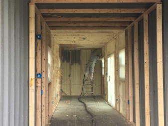 Zunächst muss der Container in Zonen eingeteilt werden. Dies erfordert den Einbau von Trennwänden. Es sollte ein Holzrahmen erstellt und dann mit einer Verkleidung versehen werden. Als Nächstes müssen Löcher für den Wasserabfluss und den Schornstein gebohrt werden. Danach muss der Fußboden verlegt werden, wobei zwei Lagen von Dielen verwendet werden können.