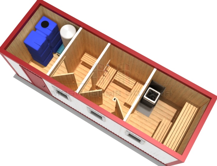 Unabhängig davon, ob die Sauna aus einem Fünf-Tonnen- oder einem Zwei-Tonnen-Container gebaut wird, muss eine solche modulare Konstruktion notwendigerweise in Zonen eingeteilt werden, damit die Nutzung des Raums komfortabler wird. Wenn man sich entschieden hat, die Anlage aus einem Metallcontainer zu bauen, ist es sinnvoll, Zonen zuzuweisen. Das sollte unbedingt der Fall sein: