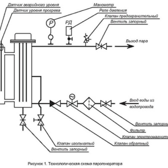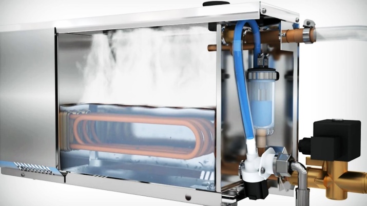 Das Funktionsprinzip des Dampferzeugers ist elementar. Das einströmende Wasser wird auf 100 - 110° C erhitzt. In der Verdampfungskammer des Geräts wird die Flüssigkeit in einen gasförmigen Zustand umgewandelt und füllt dann mit Hilfe der notwendigen Leitungen, die den Dampf vom Gerät in den Raum leiten, den gesamten Raum aus.
