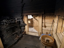Der Herd wurde in der Regel so nah wie möglich an der Tür platziert, damit das Feuer jederzeit den Raum verlassen konnte. Die Feuerstelle wurde direkt auf den Boden gestellt, die Wärme des Feuers ermöglichte es, das optimale Wärmeniveau in der Dampfkammer lange aufrechtzuerhalten. Ansonsten hatte das rustikale schwarze Badehaus die übliche Struktur: einen Dielenboden mit Fugen für die verbrauchte Feuchtigkeit, hohe Regale zum Dämpfen und Bänke.