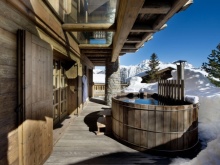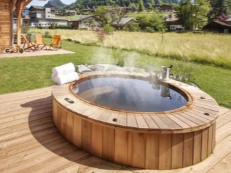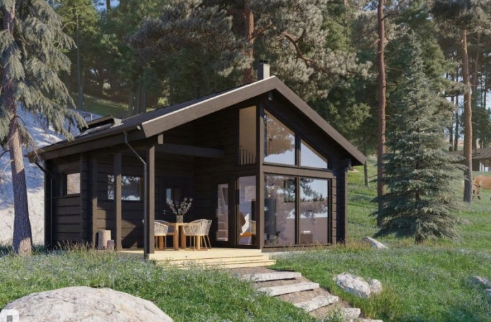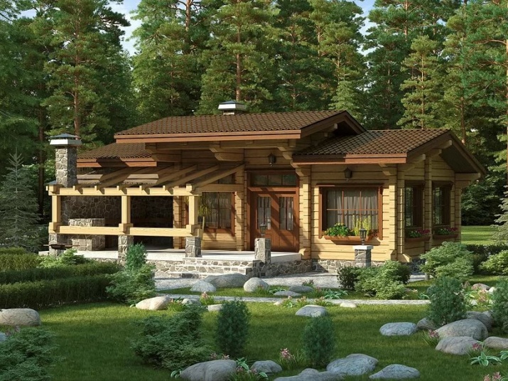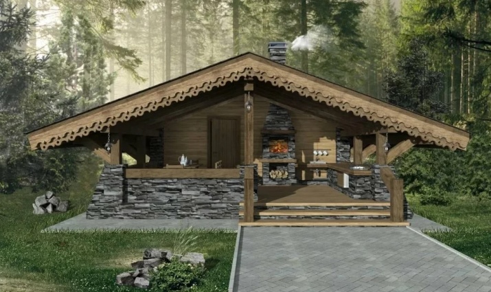 Für den Bau eines Badehauses im Chalet-Stil wird ausschließlich Holz verwendet. Mit seiner Hilfe wird es möglich sein, den ganzen Charme der Berghütte und ihren einzigartigen Komfort zu vermitteln.