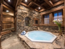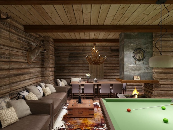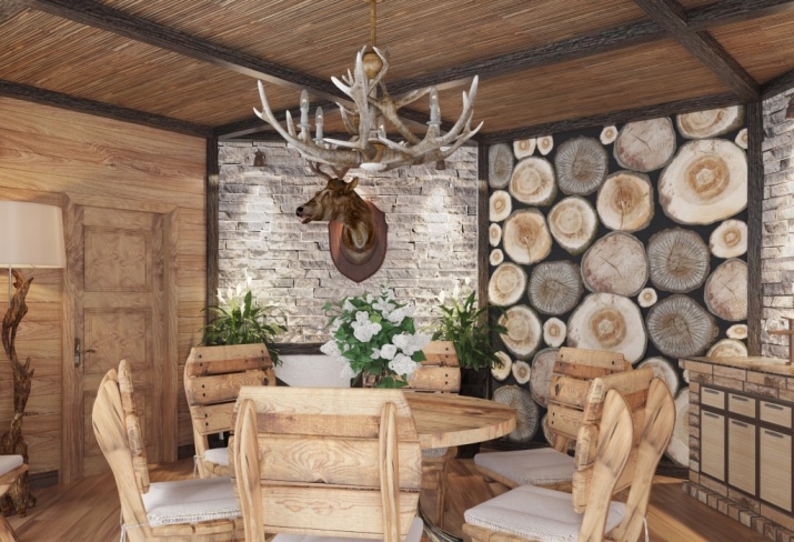 - Der Entspannungsraum mit Holz- und Steinverkleidungen wird durch einfache Holzmöbel und Jägertrophäen ergänzt. Sowohl der Kronleuchter als auch die Stehlampe haben eine originelle Form. Aber alles zusammen schafft ein Gefühl der Einheit mit der Natur.