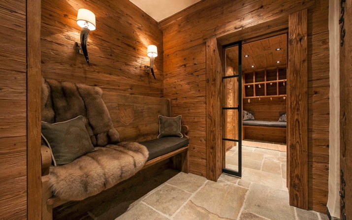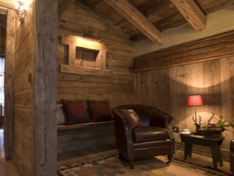 Auch bei der Innenausstattung sollten natürliche Materialien verwendet werden. Es könnte einfaches Holz sein Möbel oder Flechtmöbel. Auf dem Boden liegt ein gemütlicher Teppich, der ein Tierfell imitiert. Ein Hirschgeweih über dem Eingang oder ein Gewehr an der Wand wären als Dekoration geeignet. Eine romantischere Atmosphäre kann durch getrocknete Wildblumensträuße und Bilder von Berg- und Waldlandschaften an den Wänden geschaffen werden. Folgendes würde sehr harmonisch aussehen der Kamin.