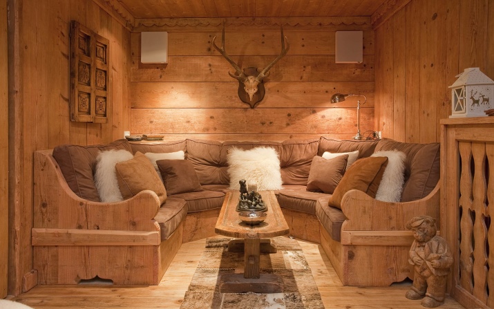 - Eine moderne Variante des rustikalen Stils. In diesem Fall sind alle erforderlichen Elemente vorhanden. Der Aufenthaltsraum ist mit Holzdekoration und angemessenem Dekor ausgestattet. Das schicke halbrunde Sofa mit weichen Kissen bietet Platz für eine große Gesellschaft und macht das Teetrinken sehr angenehm.