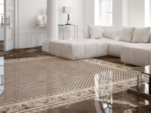 Die polierte Porzellanfliese ist im Onyx-Stil gehalten. Striche und Adern verleihen dem natürlichen Material maximale Ähnlichkeit. Das Herzstück der Kollektion ist die Keramikplatte, die dem Raum Volumen verleiht und einen Farbkontrast schafft. Das Wandpaneel besteht aus einer Hauptfliese, einem Fries und kleinen Einsätzen. Die keramischen Fliesen 44x44 in Beige und Braun werden durch elegante Friese 3x44 und 8x44, 8x8 und 3x3 Einsätze ergänzt.