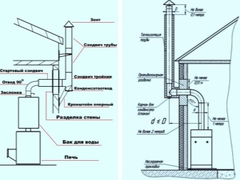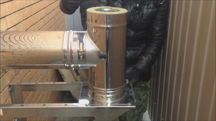 Μια παγίδα συμπυκνώματος πρέπει να τοποθετηθεί εξωτερικά στο κάτω μέρος για να συλλέγει τη συμπυκνωμένη υγρασία. Συνδέεται με το τεμάχιο Τ. Ο υπόλοιπος χώρος σε αυτό το στοιχείο καταλαμβάνεται από ένα σωλήνα σάντουιτς, ο οποίος θα ανεβαίνει και θα οδηγεί έξω τα ίδια τα προϊόντα καύσης. Πρέπει να υπάρχει ένα στήριγμα στο κάτω μέρος που θα συγκρατεί όλη τη δομή μαζί. Εάν ο σωλήνας είναι ψηλός, είναι επιπλέον απαραίτητο να τοποθετήσετε έναν ειδικό σιδερένιο σφιγκτήρα στη μέση του σωλήνα για να στερεώσετε την καπνοδόχο στον τοίχο.
