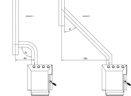 Μια πιο αισθητική επιλογή. Για παράδειγμα, ο σωλήνας δεν περνάει από την οροφή, αλλά από τον τοίχο προς τα έξω. Στη συνέχεια σηκώνεται, ακουμπώντας στον τοίχο της σάουνας. Αυτό οδηγεί σε μια πιο δύσκολη και ακριβή εγκατάσταση. Το γεγονός είναι ότι αυτός ο τύπος είναι δύσκολο να κατασκευαστεί με επάρκεια. Επομένως, θα πρέπει να μετράτε περισσότερο. Τα ίδια τα εξαρτήματα θα κοστίζουν περισσότερο, επειδή η σταθερότητα ενός τέτοιου σωλήνα είναι μικρότερη, πράγμα που σημαίνει ότι πρέπει να αγκυρωθεί πιο σταθερά. Ο κίνδυνος πυρκαγιάς είναι χαμηλός, καθώς είναι πάντα δυνατό να δούμε τον καπνό που βγαίνει από την καμινάδα. Αυτή η καμινάδα εξοικονομεί επίσης χώρο στην αίθουσα σάουνας.
