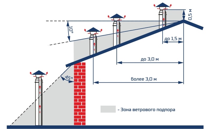 - εάν η καπνοδόχος βρίσκεται πιο κοντά από 1,5 m στην κορυφογραμμή, θα πρέπει να είναι 50 cm ψηλότερα από την κορυφογραμμή,