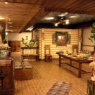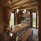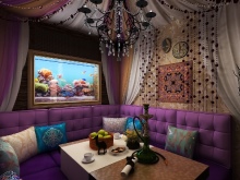 - Furniture. The main attributes in the rest room are considered benches and massive tables. To create a spiritual atmosphere, and to make the pastime more comfortable, you can additionally place soft chairs and sofas covered with patterned blankets.