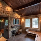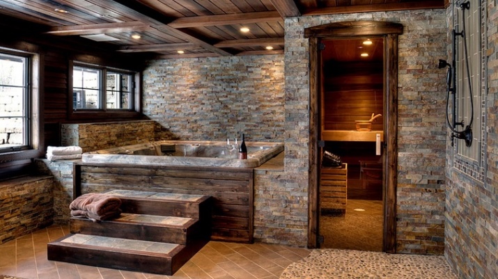 A huge role in the design of the steam rooms plays a decorative design of window openings. As curtains, you can use curtains made of bamboo or cotton. Completing the look of the interior is a fireplace. With this accessory the interior will be warmer, more cozy and comfortable.