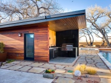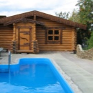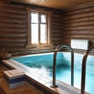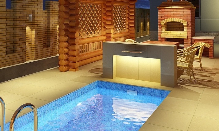 - Steam room with a swimming pool. Such a project is usually chosen by owners of large plots, as the construction takes up a lot of space. If the dacha is small, then it is possible to arrange an artificial reservoir in a separate room. The design of such a steam room should be decorated according to the latest fashion. Live plants, colored lighting, entertainment areas are welcome. For interior decoration it is desirable to choose solid light shades, outside the structure can be clad with siding of dark brown color.