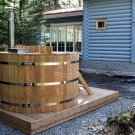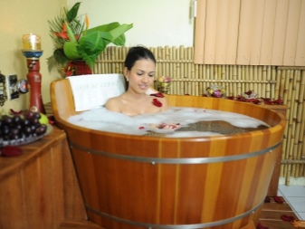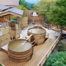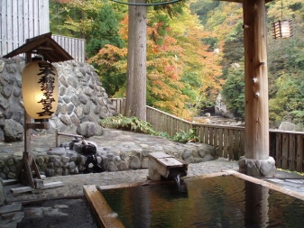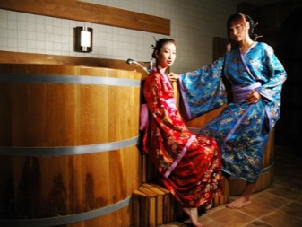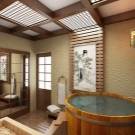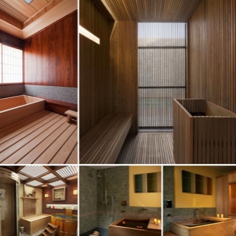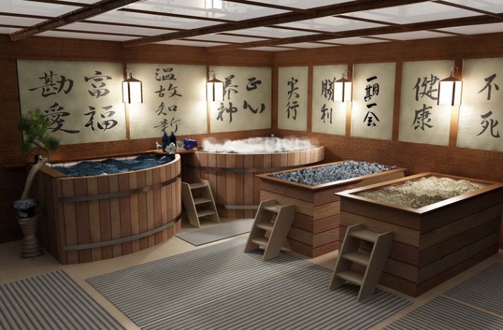 The main features of such steam rooms are considered to be the simplicity of design and unusual design of separate zones. The interior of Japanese baths is laconic, it is filled with various accessories of Japanese culture (bamboo screens, fans), as well as natural shades on the walls, the ceiling.