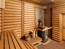 The main object in the interior of such baths is a sauna stove, which can be replaced by a gas heater or an electric stove.