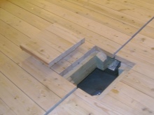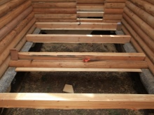 - First of all, the joists are prepared from a bar 200*200 mm, they are laid on top of the board, using the tongue-and-groove system. Since the coniferous wood emits resin when heated strongly, it is recommended to choose the material made of larch. Make sure to leave gaps between the beams to remove excess water and ventilation. In the steam room floor lifted from the main level at 15-20 cm.