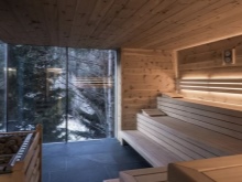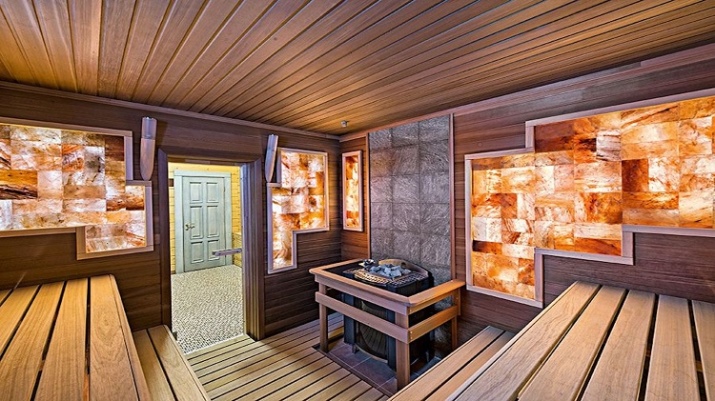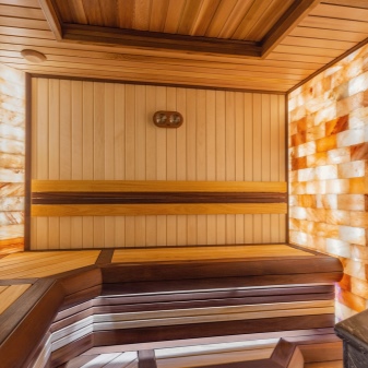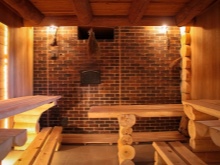 For interior decoration should use only natural materials, because they are environmentally friendly, not afraid of temperature changes, moisture and do not release when heated harmful substances. In addition to wood, cladding can be performed with bricks, glass, natural stone and ceramic tiles. In the steam room, walls lined with salt blocks look beautiful.