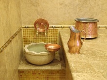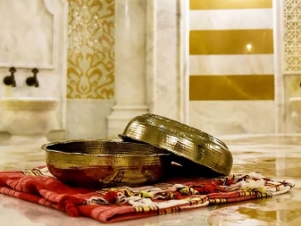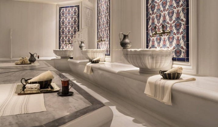 The interior of Turkish baths necessarily contains lamps corresponding to the oriental style, skarns, beautiful plumbing fixtures (taps are made of brass or copper) and finishing materials represented by mosaic and marble. Design of the hammam is characterized by restraint, brevity and a game of bright colors.