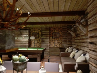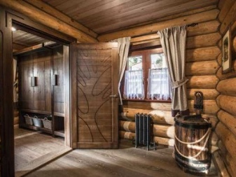 In the interior of the bathhouse there should be not only decorative elements, but also such necessary little things like hats, brooms, oils. To create a romantic atmosphere in the rooms should be organized dim lighting. As lighting fixtures, you can use small lights, exuding a soft yellow light.