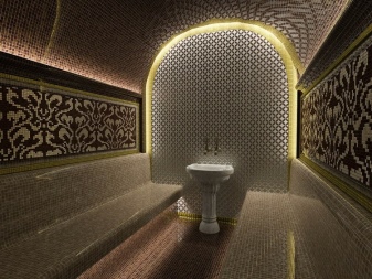It is worth paying attention to the fact that the design of the oriental steam room is based on symmetry. It can be seen not only in the patterns of ornaments, but also in the panels made of mosaics.