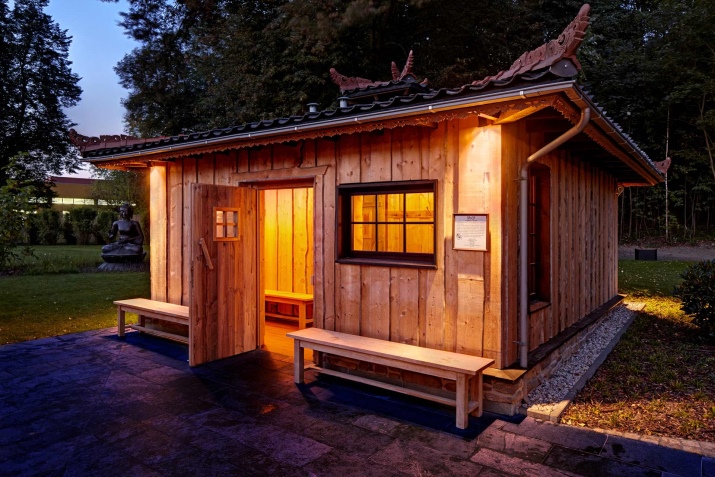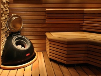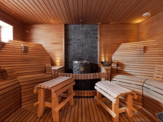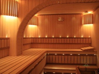 Special attention should be paid to the lighting in the steam room, as well as in other rooms. The light should be subdued, comfortable and relaxing. In the steam room it should be light fixtures equipped with grids that protect against moisture and steam. In the recreation room, these can be original lamps placed both on the ceiling and on the walls. Their shape, size and appearance will depend on the chosen style.