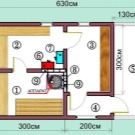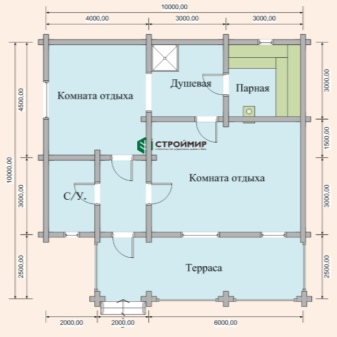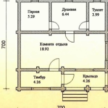 These difficulties "pay off" if you create a sauna-house, in other cases, they are less justified, although much is left to the discretion of the owners. One of these solutions (in the building of the size of 7x7 m) looks as follows on the plan.