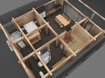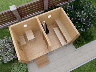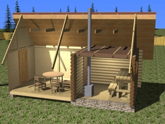 In this case, additional space savings are achieved by abandoning the separation doors and partitions. However, this solution is not the best in terms of hygiene. Uncontrolled circulation of hot air does not allow for a proper bath. A small bathhouse is often created as an extension of a house. Separate buildings try to make comfortable for everyday use.
