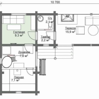 In a private bath, this room is usually calculated on the simultaneous comfortable presence of 5-6 people. In a commercial version, it is recommended to provide for at least 10 people. Even in a 3x3 m building you can have a relaxation room of 1.5 to 3 m2, which can comfortably accommodate 3-4 visitors. One suitable solution is to build an L-shaped bath with sides of 7.6 and 10.7 m (taking into account the addition of a terrace to the long side). The guest unit has 9.3 m2 and the steam room 7.1 m2.
