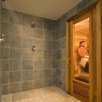 In any case, the shower area is separated from other parts of the building. In the steam room for 1-2 visitors is quite enough the only shelf with a backrest. With a fairly large size provides the use of rows of shelves. In determining the height of all rooms need to leave a reserve above the height of the tallest of the tenants of the house or invited friends. Considering the arrangement of the steam room, you can save useful space by attaching shelves to the wall, and not on the floor, leaving under them then buckets, basins, buckets.