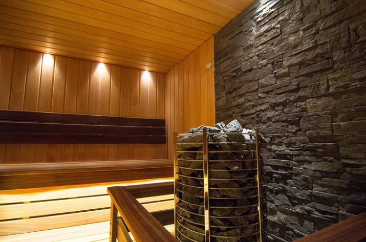 - One of the walls in the recreation room is appropriate to cover with natural stone. Sometimes this design move is also used in the design of steam rooms. Then glass ornaments and fixtures with a trendy look are also added there. To make the room seem more harmonious, the color of the stone wall and the color of the floor should match. In some cases, even the use of several stone surfaces with different (but necessarily consistent with the concept!) texture.