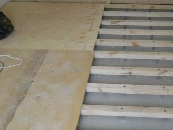 - As a new floor overlay use plywood or gypsum fiberboard sheets, which are attached to the joists with self-tapping screws. To ensure that the base is strong enough, the material is laid in 2 layers. A small space of no more than 2 cm should be left between the walls and the GFB, which is then filled with cement mortar.