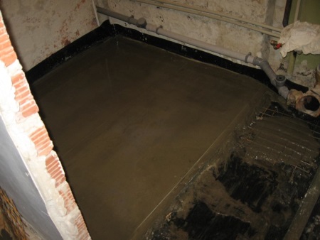 - Next, you need to take care of waterproofing of the floor this can be done with roll materials in the form of a film, or lubricants, on the type of mastic. Choosing the film, its installation should be carried out with an overlap on the walls. If you have chosen to use mastic, it should thoroughly cover the entire surface, especially the joints between the walls and the floor.