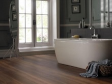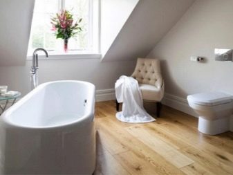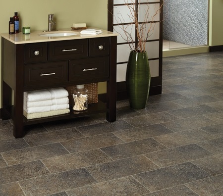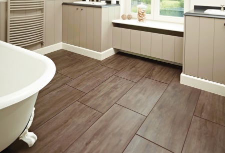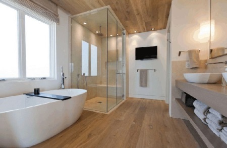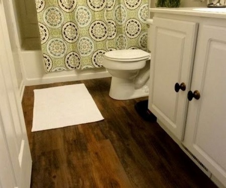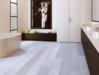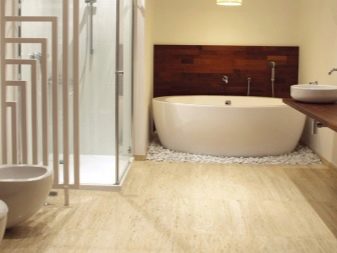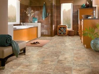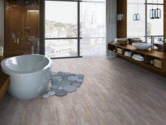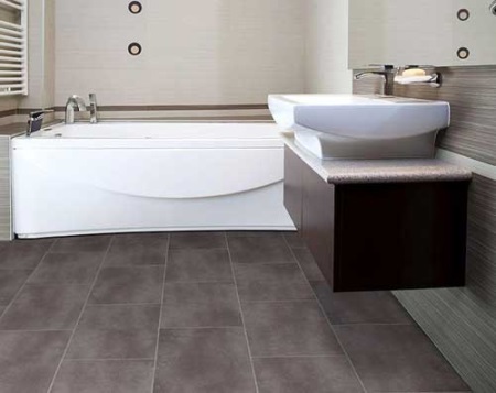 An excellent example of the use of vinyl tiles in the bathroom - it is impossible not to agree with this. The color of the tiles is matched very well to the overall interior, the good thing is that the range of this flooring opens up a wide range of possibilities for designers.