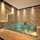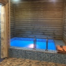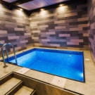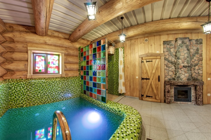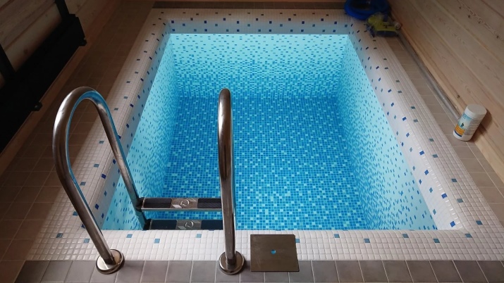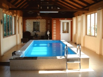La zona de la piscina se puede calentar con dispositivos de calefacción eléctrica y suelo radiante. Muchas personas se calientan con una caldera común que utiliza gas, electricidad o leña. Es bastante eficaz y seguro calentar la habitación y la superficie del agua mediante lámparas de infrarrojos colocadas alrededor del perímetro. Los modelos de deshumidificadores de bajo coste pueden utilizarse con la ventilación adecuada. No sólo ayudan a eliminar el exceso de humedad, sino también a calentar el aire. El diseño de la piscina se completa con barandillas de acero inoxidable brillante a lo largo de la parte superior de las paredes interiores y en el escalón de bajada. Alrededor de ella se pueden colocar tumbonas de madera, en las paredes a menudo hacen patrones decorativos de diferentes tipos de piedra o mosaicos.